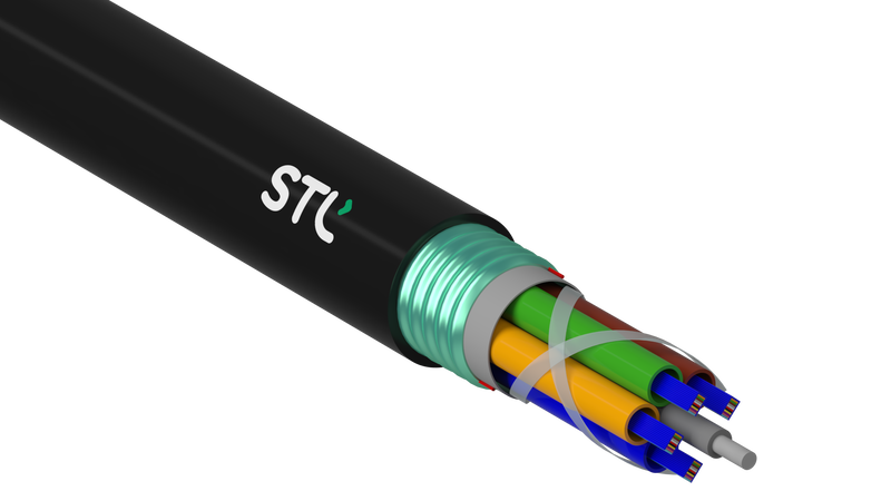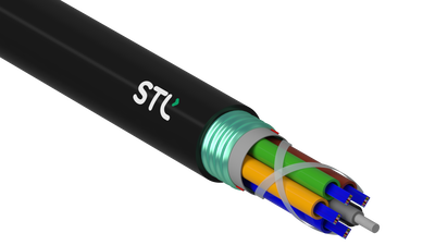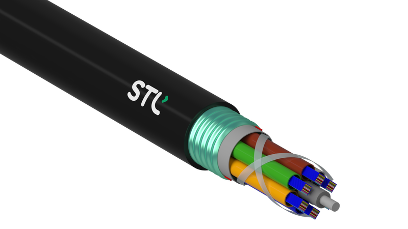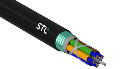 STL RIBBON-LITE Multitube Steel Tape Armored Cable combines robust performance for duct installations with the productivity of high-count mass fusion splicing. Twelve optical fibers are arranged into ribbon units by placing the fibers in a flat array of color coded fibers bonded together by a UV-curable acrylate matrix. RIBBON-LITE comes with gel free technology, the buffer tubes contain water swellable yarns and is surrounded with water-swellable tape to prevent water ingress in the cable. The buffer tubes are stranded around the central strength member using reverse oscillation stranding method forming the cable core. Corrugated Steel Tape armor surrounds the cable core with thermoplastic jacket placed over the armor layer making the cable robust and installation friendly.