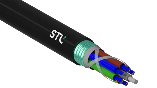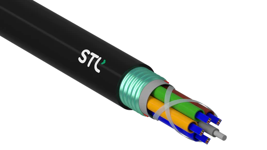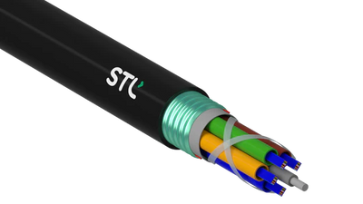 STL RIBBON-LITE Multitube Steel Tape Armored Cable combines robust performance for duct installations with the productivity of high-count mass fusion splicing. Twelve optical fibers are arranged into ribbon units by placing the fibers in a flat array of color coded fibers bonded together by a UV-curable acrylate matrix. RIBBON-LITE comes with gel free technology, the buffer tubes contain water swellable yarns and is surrounded with water-swellable tape to prevent water ingress in the cable. The buffer tubes are stranded around the central strength member using reverse oscillation stranding method forming the cable core. Corrugated Steel Tape armor surrounds the cable core with thermoplastic jacket placed over the armor layer making the cable robust and installation friendly.